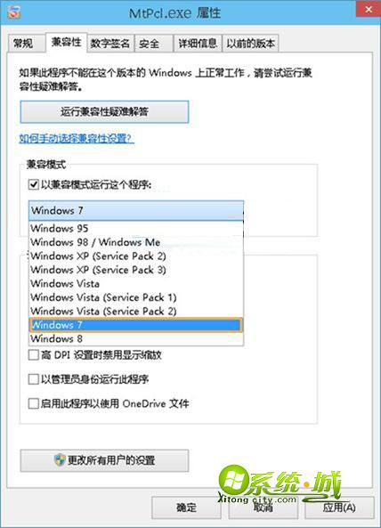 2、在文件属性对话框,点击切换到“兼容性”选项界面,点击勾选“以兼容模式运行这个程序”,然后点击下面的向下箭头,选择自己合适的系统版本;