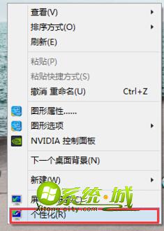 1、桌面空白处鼠标右键,在弹出的菜单中选择“个性化”;
