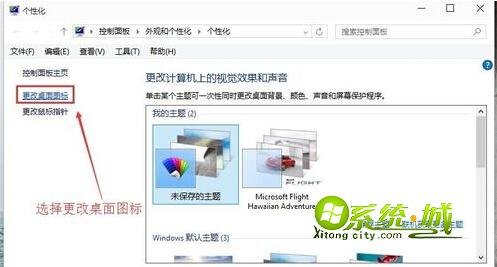2、点击“个性化”窗口左侧的“更改桌面图标”;