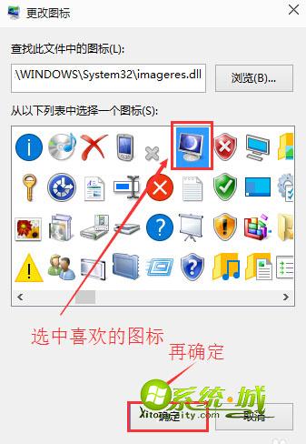4、在更改图标对话框中,选择所需图标,点击确定;