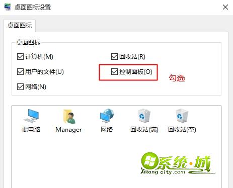 2、在桌面图标设置窗口中,勾选“控制面板”,确定;