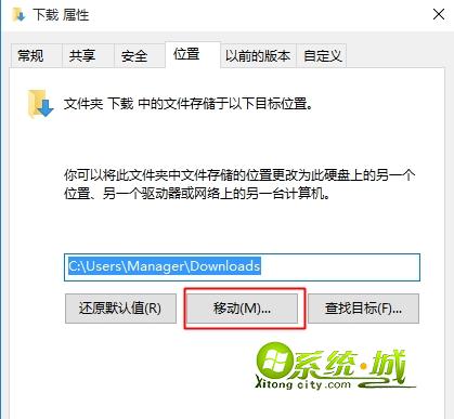 2、打开“下载”属性,切换到“位置”,点击“移动”按钮修改默认保存位置;