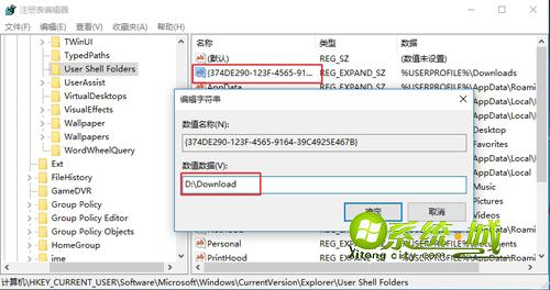 5、在右侧找到“{374DE290-123…}”,右键点击修改,在数值数据中输入保存路径,比如D:\Download,确定;