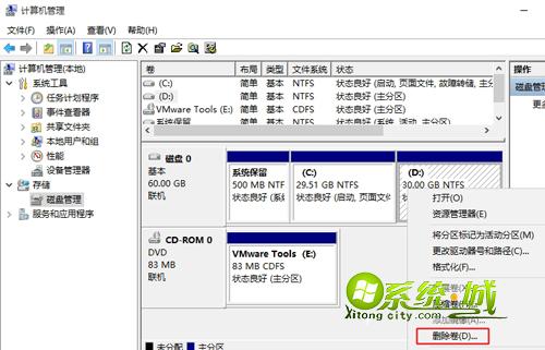 2、打开计算机管理,右键点击需要合并的磁盘,选择“删除卷”,硬盘文件将被删除;