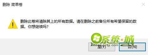 3、提示删除此卷将清空硬盘数据,已经备份好文件则点击是;