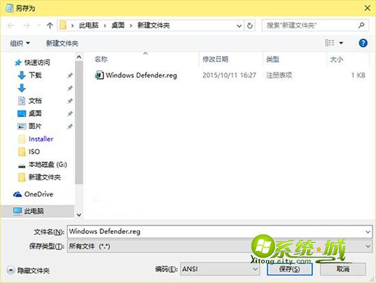 2、依次点击“文件”—“另存为”,文件名输入任意文字加后缀.reg,比如“Windows Defender扫描.reg”,保存类型为“所有文件”;