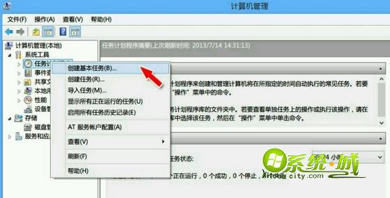 2、右键点击“任务计划程序”,选择“创建基本任务”;