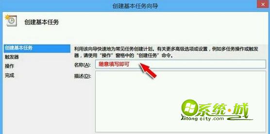 3、弹出创建基本任务向导,填写任务”名称”和”描述”,比如宽带自动连接;