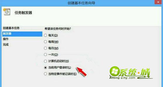 4、在任务触发器中,选择“当前用户登录时”,下一步;