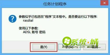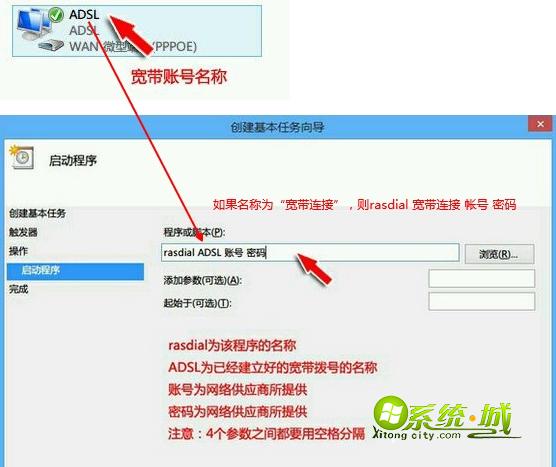 6、程序或脚本中输入参数:rasdial 宽带连接名称 宽带帐号 宽带密码,下一步;