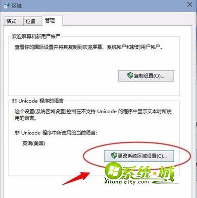 3、打开区域对话框,在“管理”中,点击“更改系统区域设置”;