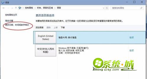 2、在语言设置窗口左上角点击“更改日期、时间或数字格式”;