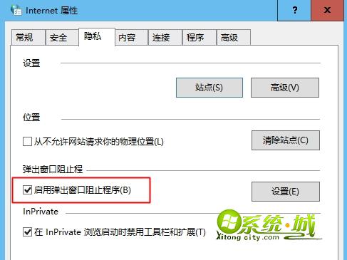2、在“隐私”选项卡,勾选“启用弹出窗口阻止程序”,点击“设置”;