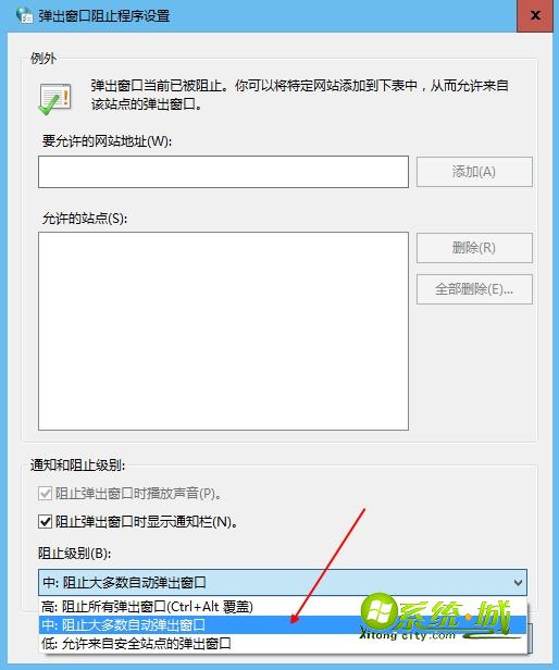 3、勾选底部“阻止弹出窗口时显示通知栏”,选择高、中、低三种阻止级别。