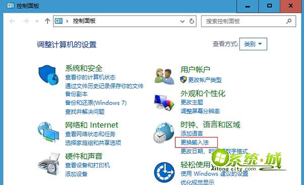 2、查看方式选“类别”,在“时钟、语言和区域”下方点击“更换输入法”;
