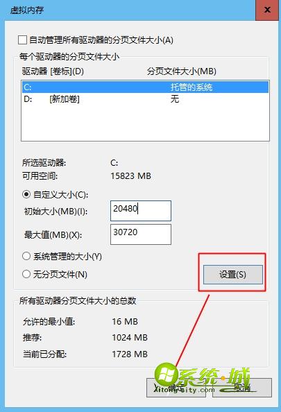 4、点击任意磁盘,勾选“自定义大小”,虚拟内存通常为物理内存1-3倍,输入初始大小和最大值,点击“设置”,再点击确定;