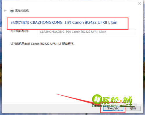 8、驱动程序安装完成后提示打印机已成功添加,点击“下一步”;