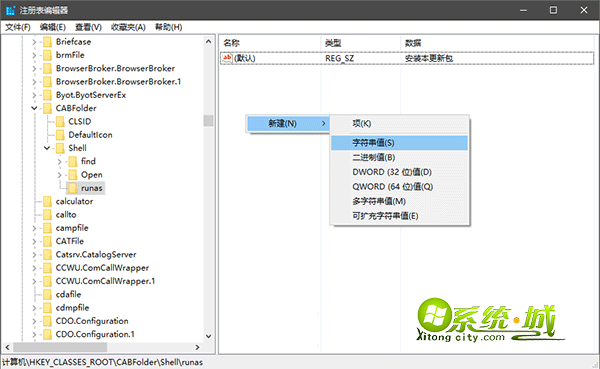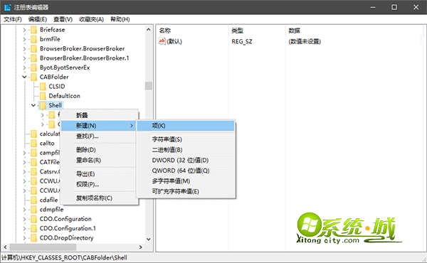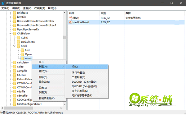 2、展开注册表项HKEY_CLASSES_ROOT\CABFolder\Shell,右键Shell—新建—项,命名为runas;