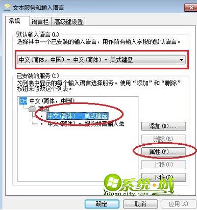 二、在弹出的“文本服务和输入语言窗体里面”,点击“中文(简体)---美式键盘”,这时,右边的属性按钮就可以点击了。点击那个属性按钮;