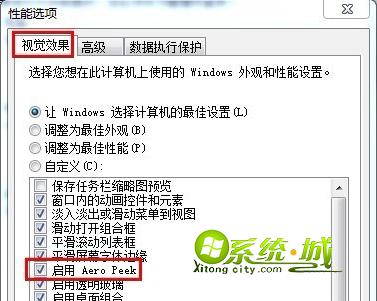 四、进入性能选项窗口,点击【视觉效果】标签,在Windows 外观和性能设置列表中找到“启用 Aero Peek”,打上勾,单击“确定”;