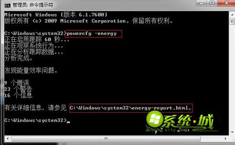 二、在命令提示符窗口中输入命令:powercfg –energy,程序将会自动开始对系统的60秒状态跟踪,并分析所获得的数据然后给出报告,这个过程最好不要操作电脑;