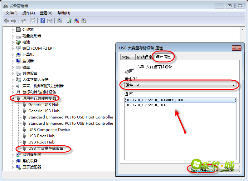 5、需要复制“通用串行总线控制器”中“USB大容量存储设备”的硬件ID。操作方法方法跟硬盘驱动器中的硬盘ID方法一样。重复操作一遍,复制并保存USB大容量储存设备硬件即可;