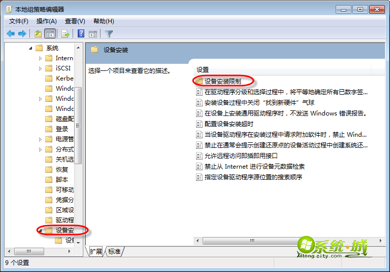 7、在本地组策略编辑器中,依次展开“计算机配置→管理模板→系统→设备安装→设备安装限制”;