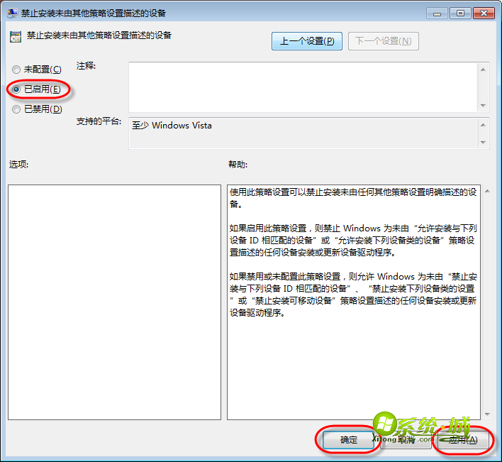 8、打开右侧的“禁止安装未由其他策略设置描述的设备”,在弹出的窗口中选择“已启用”,点击应用;