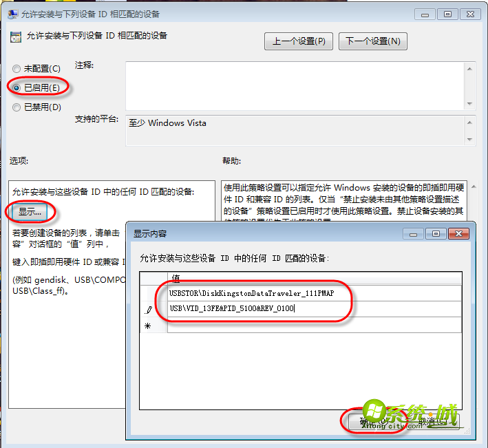 9、回到本地组策略编辑器界面打开“允许安装与下列设备ID相匹配的设备”,勾选“已启用”,在“选项”窗格中点击“显示”按钮,将硬件ID复制并添加进文本框;