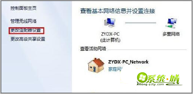 1、任务栏选择“打开网络和共享中心”,在弹出的窗口中点击左侧的“更改适配器设置”选项;