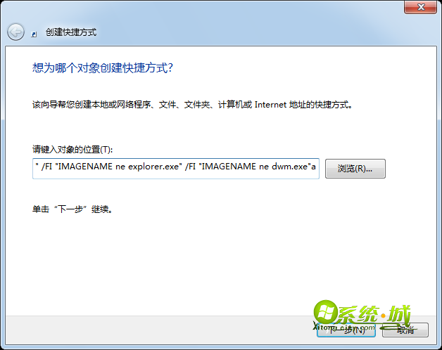 2、新建后在位置栏输入taskkill /F /FI "USERNAME eq admin" /FI "IMAGENAME ne explorer.exe" /FI "IMAGENAME ne dwm.exe";