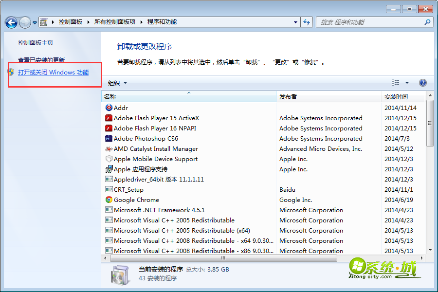 2、在“在程序和功能”窗口中找到并点击“打开或关闭Windows功能”进入Windows 功能设置对话框;