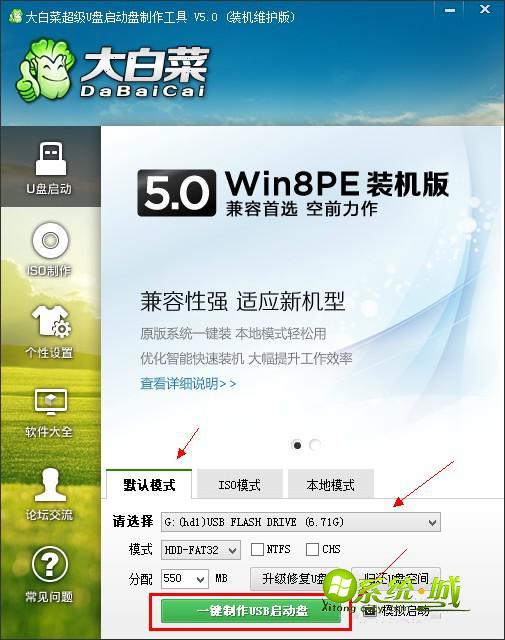 第二步:首先插入U盘,右键点击U盘,弹出菜单选择快速格式化(切记U盘中重要文件事先要备份出来,以防丢失),然后启动大白菜软件,界面如下图,点击界面最下方的“一键制作U盘启动”按钮,进入自动制作U盘启动盘;