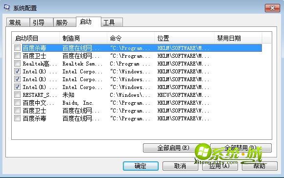 2、打开系统配置,在“启动”栏目中,将不必要的启动项前面的勾号去除,点击应用。