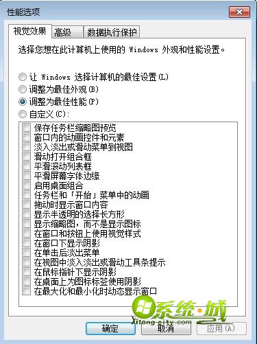 3、在视觉效果中,选择“调整为最佳性能”,点击确定。