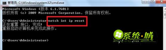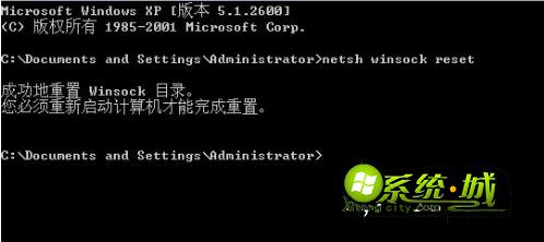 6、在命令提示符中,输入netsh winsock reset,按回车执行重置Winsock。