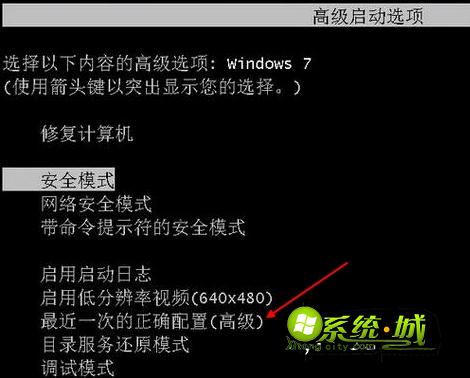 1、重启系统按下F8,在高级启动选项中,选择“最近一次的正确配置”;