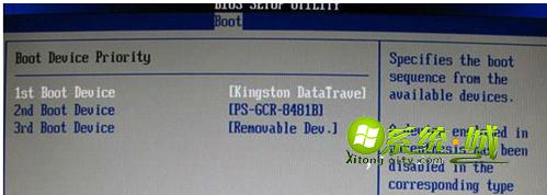 1、启动优先级设备选择(Boot Device Priority)在第一启动设备(1st Boot Device)里选择U盘。在硬盘驱动器“Hard Disk Drives”里面还没选择U盘为第一启动设备,那么这里就不存在和显示U盘,如下图所示,但可以选择移动设备“Removable Dev.”作为第一启动设备。