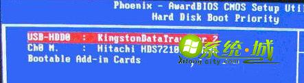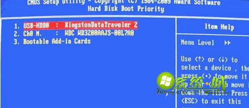 3、硬盘启动优先级(Hard Disk Boot Priority)选择:使用键盘上的上下键来选择与移动设备,将U盘选择在最上面,然后按Entel键确认选择。然后,按ESC键退出,回到如下图的设置界面。在第一启动设备(First Boot Device)这里,有U盘的USB-ZIP、USB-HDD之类的选项,我们既可以选择“Hard Disk”,也可以选择“USB-HDD”之类的选项,来启动电脑。