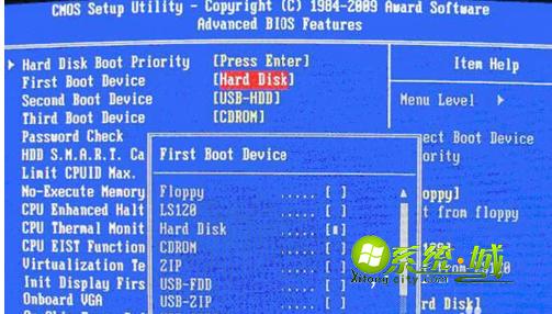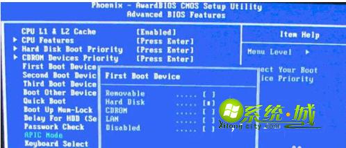 系统城提示:另外有的主板还会进入如下界面,我们主要将First Boot Device这只为U盘即可,如下图。再选择第一启动设备(First Boot Device)。