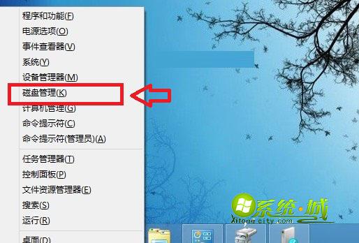 步骤一、在Win8桌面界面上,同时按住Win+X组合快键打开Win8系统菜单,选择“磁盘管理”选项,进入Win8磁盘管理;