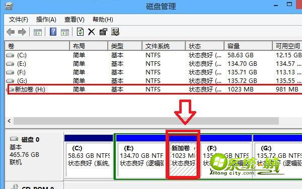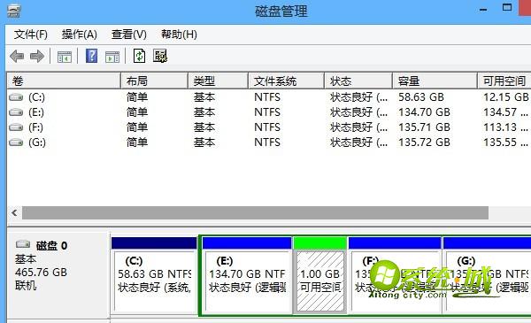步骤四、当压缩完成后我们就会看到在磁盘管理中多出了一个新的“1G可用空间”,但我们会发现这个分区与其他有点不一样,并且当前为不可用状态,我们还需要进行以下操作才可以完成Win8磁盘分区。