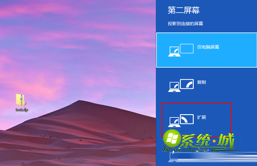 步骤二、选择好主题并安装,主题就被安装到“个性化”。还有一个更重要的步骤要去完成。使用“Windows键+P”的组合键调出“第二屏幕”设置项,看到连屏的方式,包括“仅电脑屏幕”、“复制”、“扩展”和“仅第二屏”。必须选择“扩展”选项,全景主题的效果。