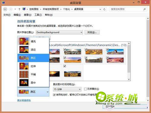 步骤四、需要进入下方的“桌面背景”,然后在“图片放置方式”中选择“跨区”选项,会发现两个屏幕显示的壁纸合并成了一幅超长的全景图像。