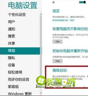 2、在“常规”选项中,最后一个“高级启动”,选择“重启”就可以;如下图所示: