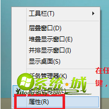 2、在任务栏空白处单击右键,选择“属性”如下图所示: