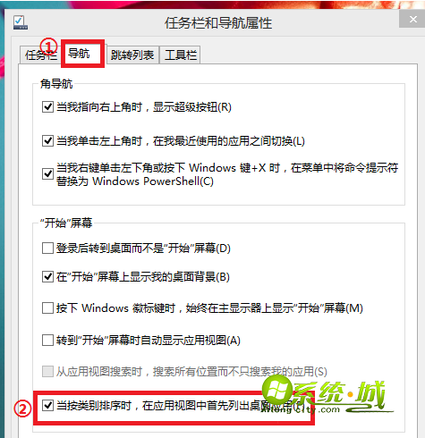 3、导航选项卡中,有个“当按照类别排序的时候,在应用视图中首先列出桌面应用”,勾选此项则在程序菜单中,首先列出桌面应用,如果不勾选此项的话,首先列出Metro应用。如下图所示:
