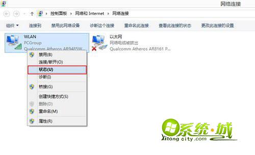 1、在无线网络连接设置窗口中,找到当前连接的无线网络“WLAN状态”,右击查看“状态”;如下图所示:
