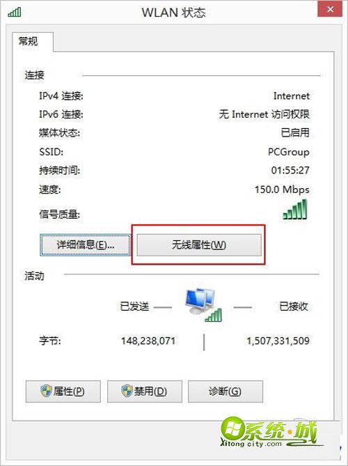 2、在“WLAN状态”窗口中找到“无线属性”;如下图所示: