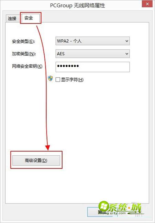 3、进入“无线网络属性”窗口,切换到“安全”页面,点击“高级设置”;如下图所示:
